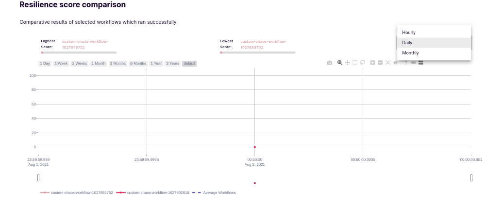 In first tab, you can compare number of chaos scenario runs according to selected granuality i.e. Daily/Monthly/Hourly. Granuality can be changed using drop-down in top right corner.