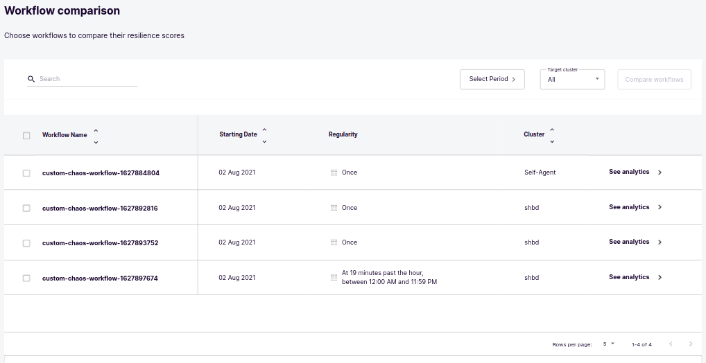 For comparing the chaos scenarios, you can select the scenarios from the table & click on Compare Chaos Scenario button.